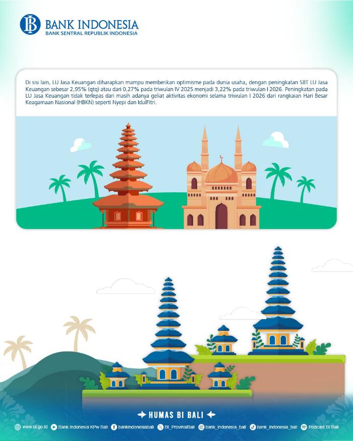 Peningkatan pada LU Jasa Keuangan tidak terlepas dari masih adanya geliat aktivitas ekonomi selama triwulan I 2026 dari rangkaian Hari Besar Keagamaan Nasional (HBKN) seperti Nyepi dan IdulFitri.